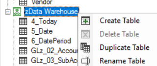Right click on the zData Warehouse icon in the center panel and select create table.