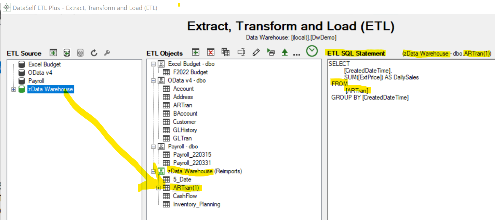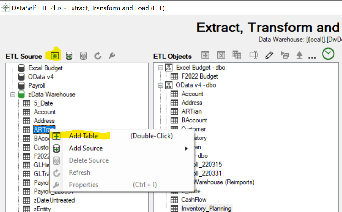 On the ETL Source panel, select zData Warehouse and click the Refresh icon to list the tables already loaded into the data warehouse. Then select ARTran and click the Add Table icon (or Right-click on the table and select Add Table). See below.