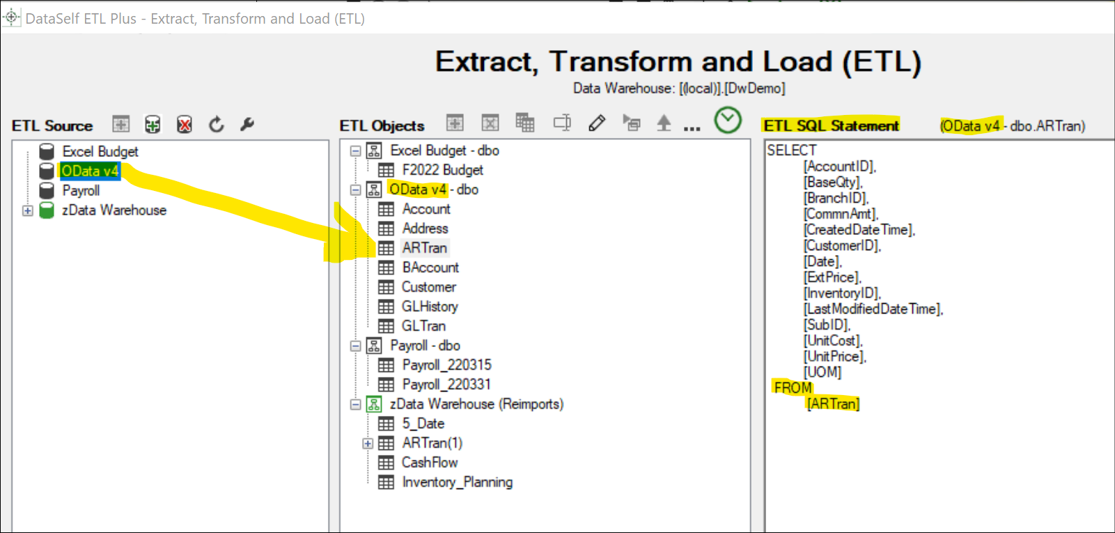 For instance, ARTran below has been extracted from an OData v4 source into the data warehouse. It contains detailed sales transactions. This table will remain in the data warehouse for detail-level reporting.