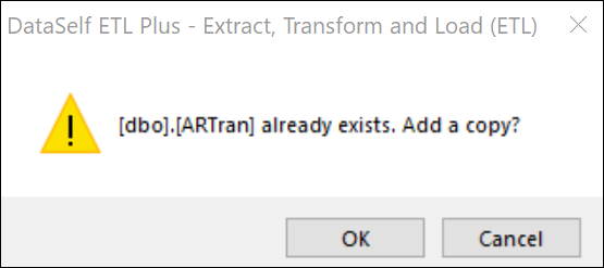 ETL+ does not allow duplicate table names. The new table name will add (1) at the end to distinguish it from the original. You can modify the table name as desired.