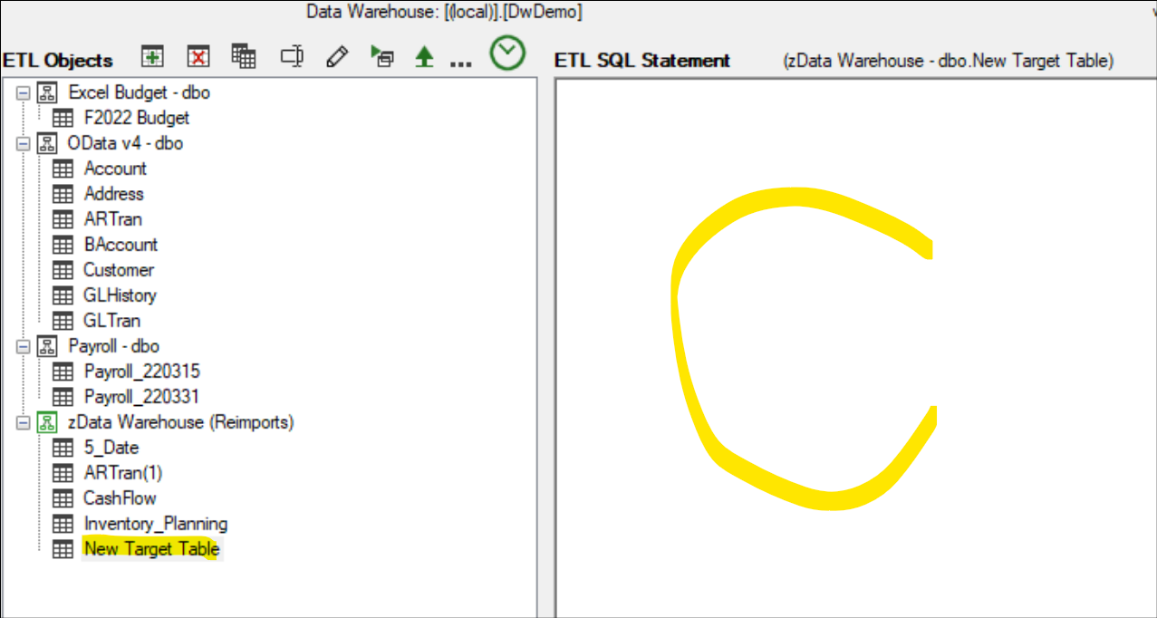 This will create a "NEW TARGET TABLE" with no SQL statement. Note the blank ETL SQL Statement. You can copy/paste or manually write the SQL query statement. Make sure to add the schema name in the FROM clause to point to the existing SQL table as the source rather than the ERP data source.